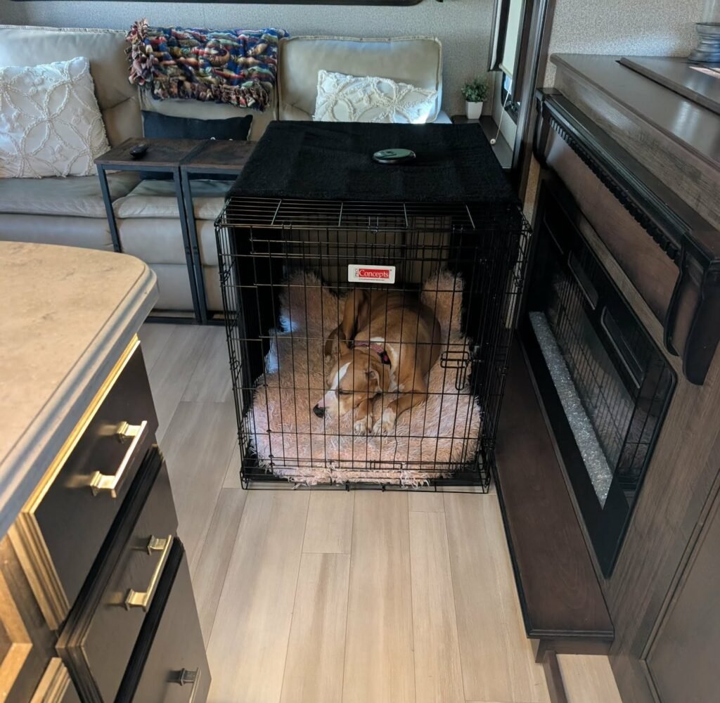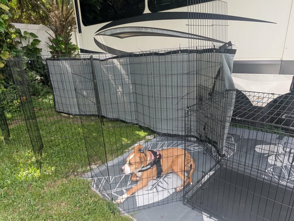 We used a 16 panel playpen attached to a large double door crate for each of them. The pooches can enter through the crate’s side door and we can enter the pen through the walk gate, to clean up their waste. We also used a mesh fencing tarp on one side for privacy because other dogs were in close proximity on another site. Solaris is not aggressive but is dog reactive and guards her personal space and people.