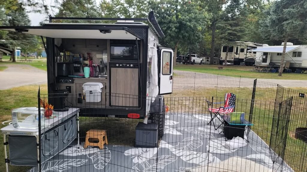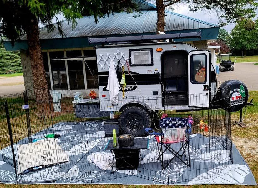 I loved this little camper, but obviously it was built for one person or a smaller couple. It was perfect for me and Solaris, my little watchdog. I used a waterproof blanket for her that allowed her on the sofa bed and I also took her doggy bed that fits perfectly next to the camper bed when it’s pulled out. The camper has a screen door, but I left it open most of the time so that she could go in and out freely whenever her fence was set up. Not all campgrounds allow it though, so that’s when I had to utilize the screen door. I talk a lot about the different tools we use with her but without them, she wouldn’t be able to travel or go anywhere. I’m trying to give her the best life I can with the tools available, and hopefully help anyone else with reactive or aggressive dogs. Traveling in a camper is an option! My girl loves camping about as much as I do though, and that makes it much more fun.