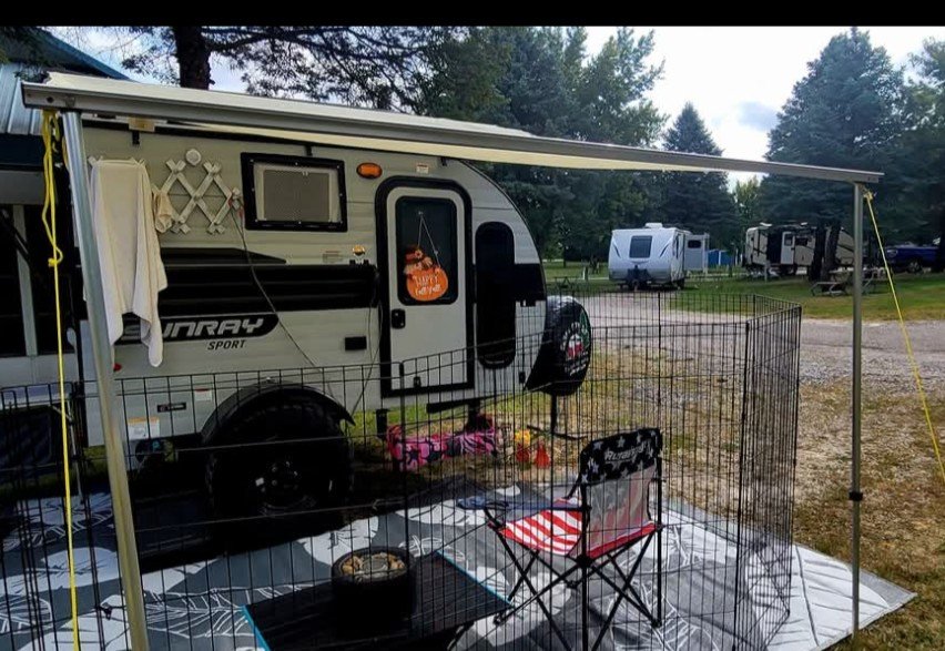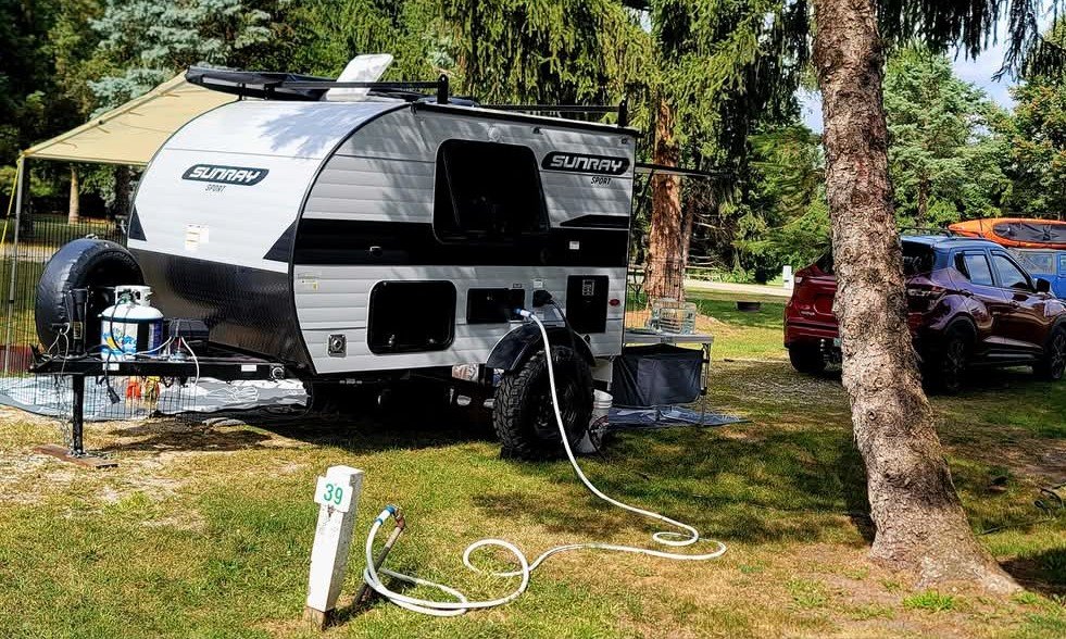 I opted for a 2024 Sunset Park Sunray 109 Sport. It has an off-grid sport package, meaning it has off-grid tires, suspension, solar package, roof rack, awning and screen door. It does not have a grey or black tank which makes it lighter. It does have a water tank & propane water heater, propane heat & stove, and an air conditioner. It has a TV & cable connection too, but I’m not much of a TV girl, so I just used my Kindle.