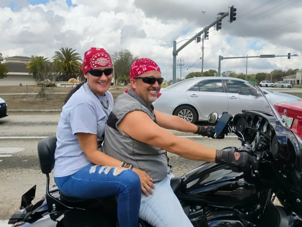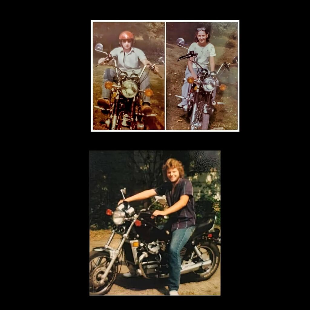 So anyway, back when I was a teenager I learned to drive a Honda 650 motorcycle. My dad had been an avid motorcyclist when he was younger and used to ride with my mom, but after being in a couple of serious accidents, either he or my mom decided that they weren’t going to ride anymore. So when my dad found out that I had been driving, he took my boyfriend (aka my late husband) aside and gave him the kind of lecture that you listen to if you want to keep your girlfriend. After that I wasn’t allowed to drive it anymore. I remember hearing the “F” word come out of my dad’s mouth for the first time ever and I became a backseat rider after that. We were allowed to drive cars, trucks, four wheelers, three wheelers, dirt bikes, tractors and whatever else he approved of, just not a two wheeled motorcycle on the street. So in reality, I have been riding longer than Jason, but only briefly. Fast forward several years, and I decided it was time for me to drive one again, so I took a MSF course and got my endorsement. (Photos from top left to bottom: my dad, my mom, and my late husband on the motorcycle I learned to drive as a teenager.)